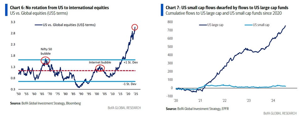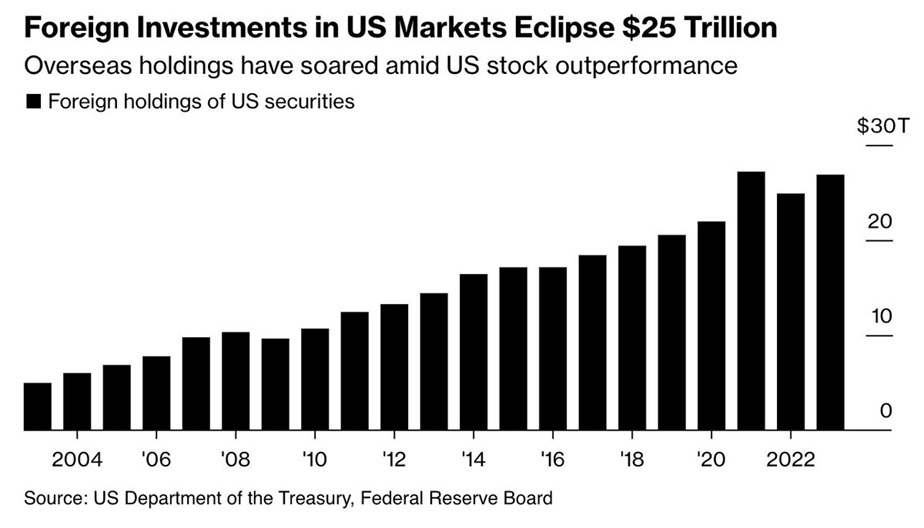 First, I'd ask why. Why are international investors investing in U.S. stocks at a pace higher than ever? Is it because the U.S. is leading in AI? Is it because the U.S. economy has been the most resilient in the world? Or is it because U.S. currencies have been devaluing? I think it's all of those, but the ladder is the most important to write about. We know that the U.S. is leading in AI as regulation has been little, and investing has been gigantic. We also know that the U.S. economy has been the most resilient large economy in the world, primarily due to our diverse GDP make-up. Still, it's hard to have a growth decline when you run the largest fiscal deficit of all time during peacetime. The United States' resiliency has allowed the dollar to outperform weaker countries, and even with fiscal debt looming, the dollar is outperforming.