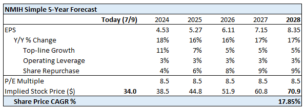 NMIH is a small cap that has been forgotten as it operates in an industry where investors have had scars since 2008. NMIH trades at a slight discount to comps at 8x next year's earnings for best-in-class credit quality, balance sheet, and growth. I believe NMIH can achieve a conservative mid-teens IRR based on share repurchases, higher portfolio yield, and LSD mortgage origination volume growth. However, it is more likely that NMIH compounds in the high-teens when accounting for higher growth in mortgage origination volumes driven by higher home prices, more new homes and existing homes sold, share gains, and a flat cost base driving margins higher as the top-line grows.